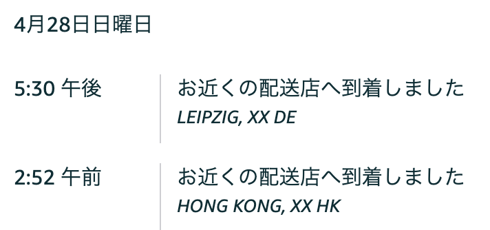 購入2日目の夕方5時半にドイツに到着。購入したのが4月26日の23時くらいで4月28日の17時半にはドイツに届いています。購入から約1.5日で日本からドイツに届きました。想像より遥かに速いです。